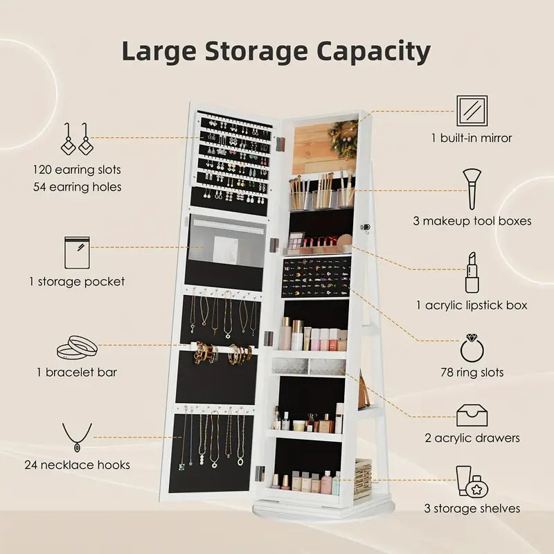 - Storage: Armoire With Storage Shelf. 120 slots for earrings and 54 holes, along with a storage pocket and a bracelet bar. There are 24 hooks for necklaces, 78 slots for rings, a built-in mirror, three makeup tool boxes, an acrylic lipstick box, two acrylic drawers, and three storage shelves.