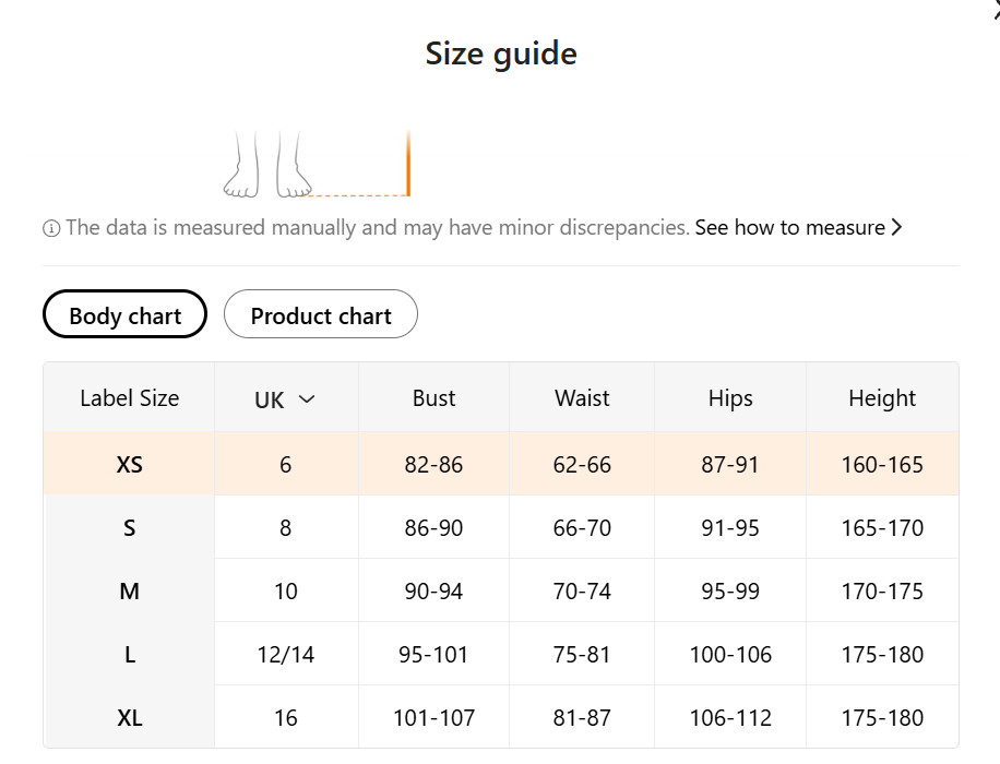 - Size: Ranges from XS (UK Size 6) to XL (UK Size 16).